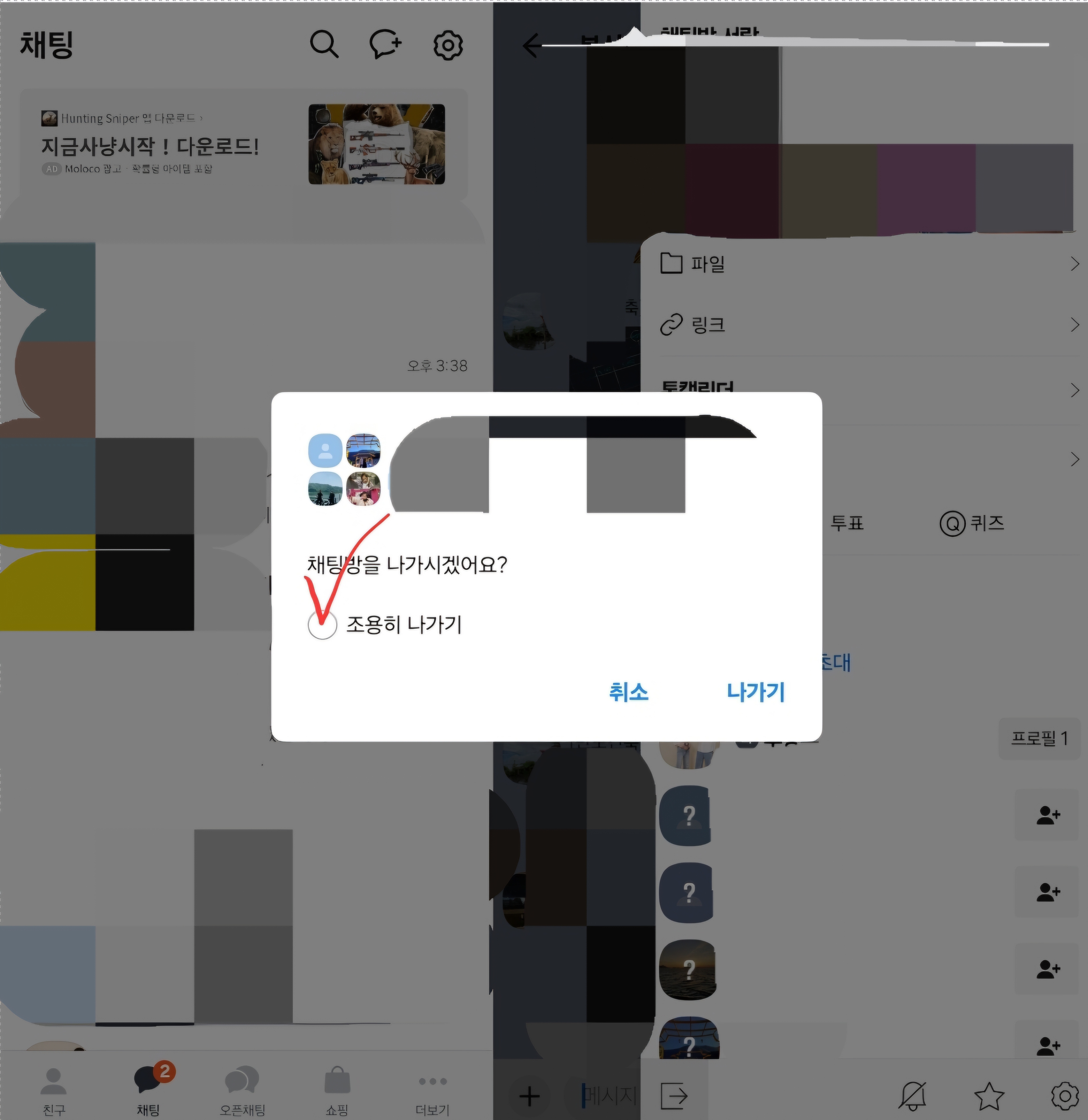 2인 채팅, 비밀 채팅에서는 '채팅방 조용히 나가기'기능을 사용할 수 없습니다.