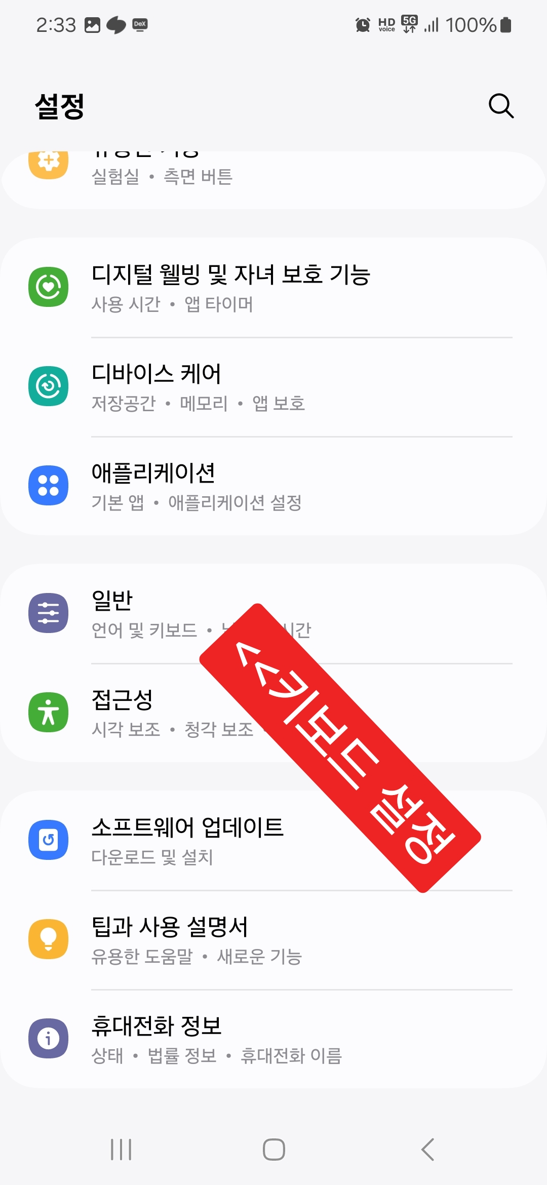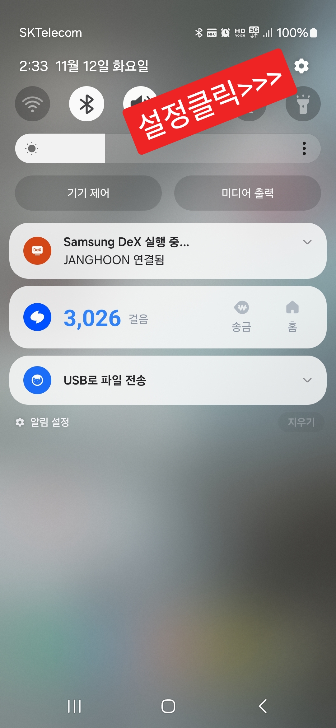 갤럭시 스마트폰 알림바를 내린 다음 설정에 들어가세요.