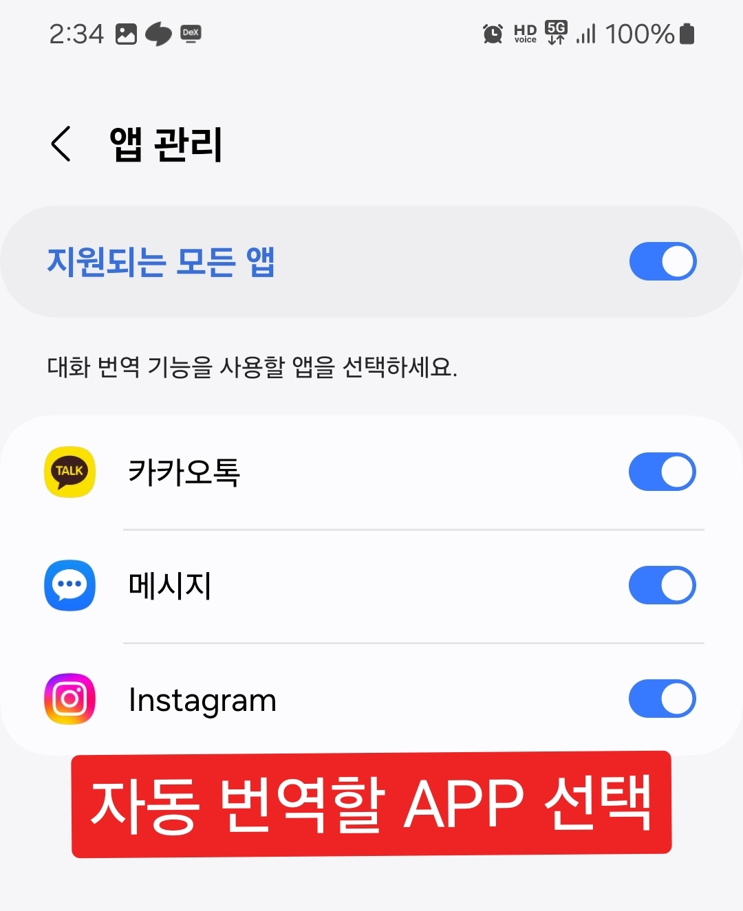 - 자동번역 사용할 APP를 활성화 하세요.