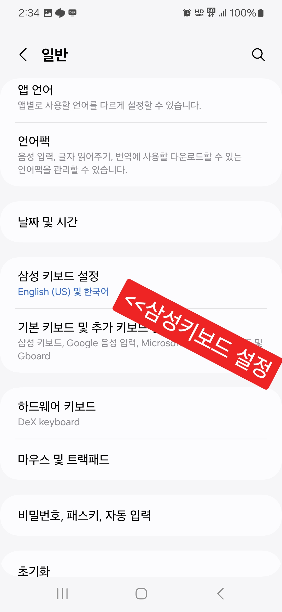 - 아래로 내린 다음 "일반(언어 및 키보드)"설정 터치.