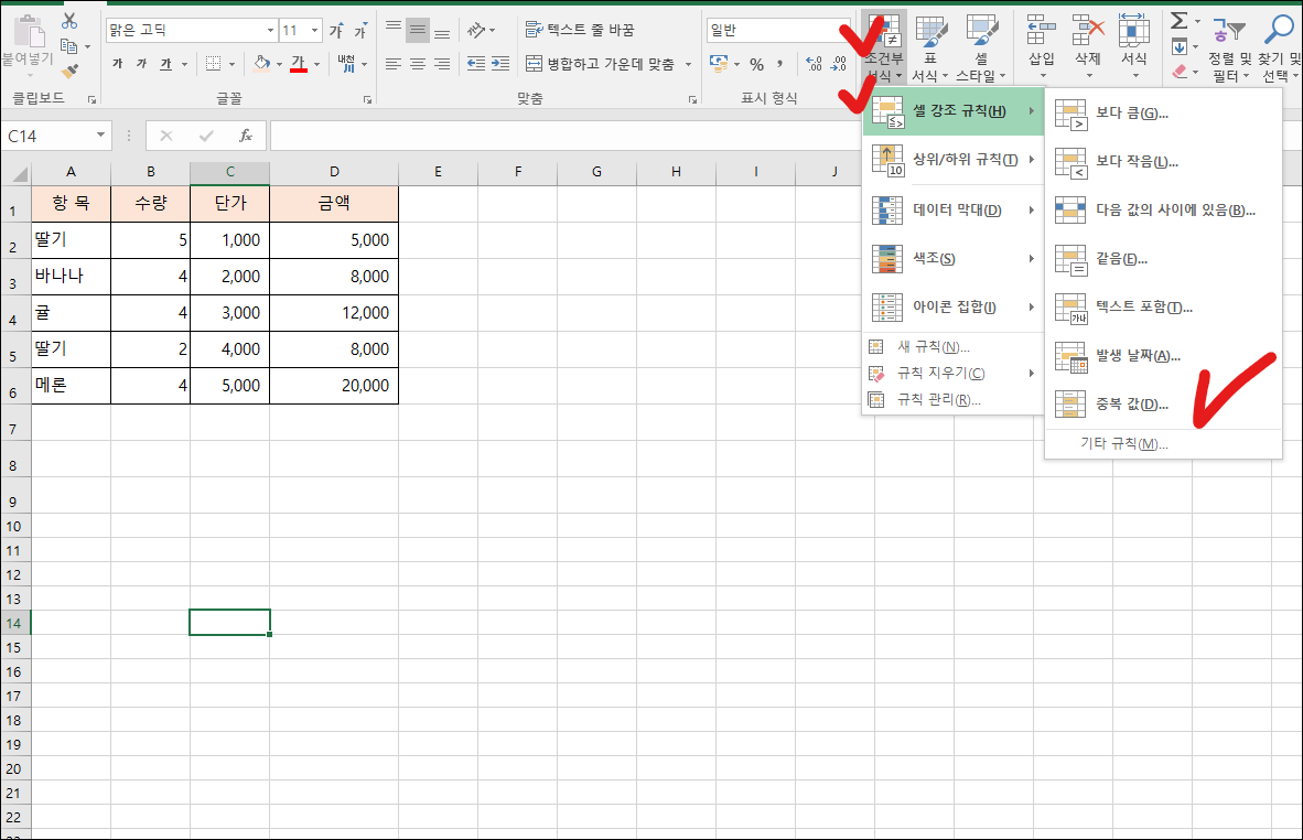 위 표에서 항목열에서 중복값을 찾았지만, 만약 다른 열에서 찾아야 한다면 "A:A"를 "C:C"로 변경하여 사용할 수 있습니다.