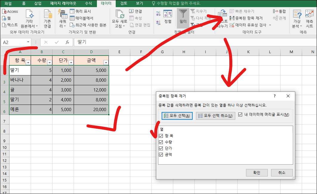 - 상단 메뉴에서 [데이터 > 중복된 항목 제거] 선택.