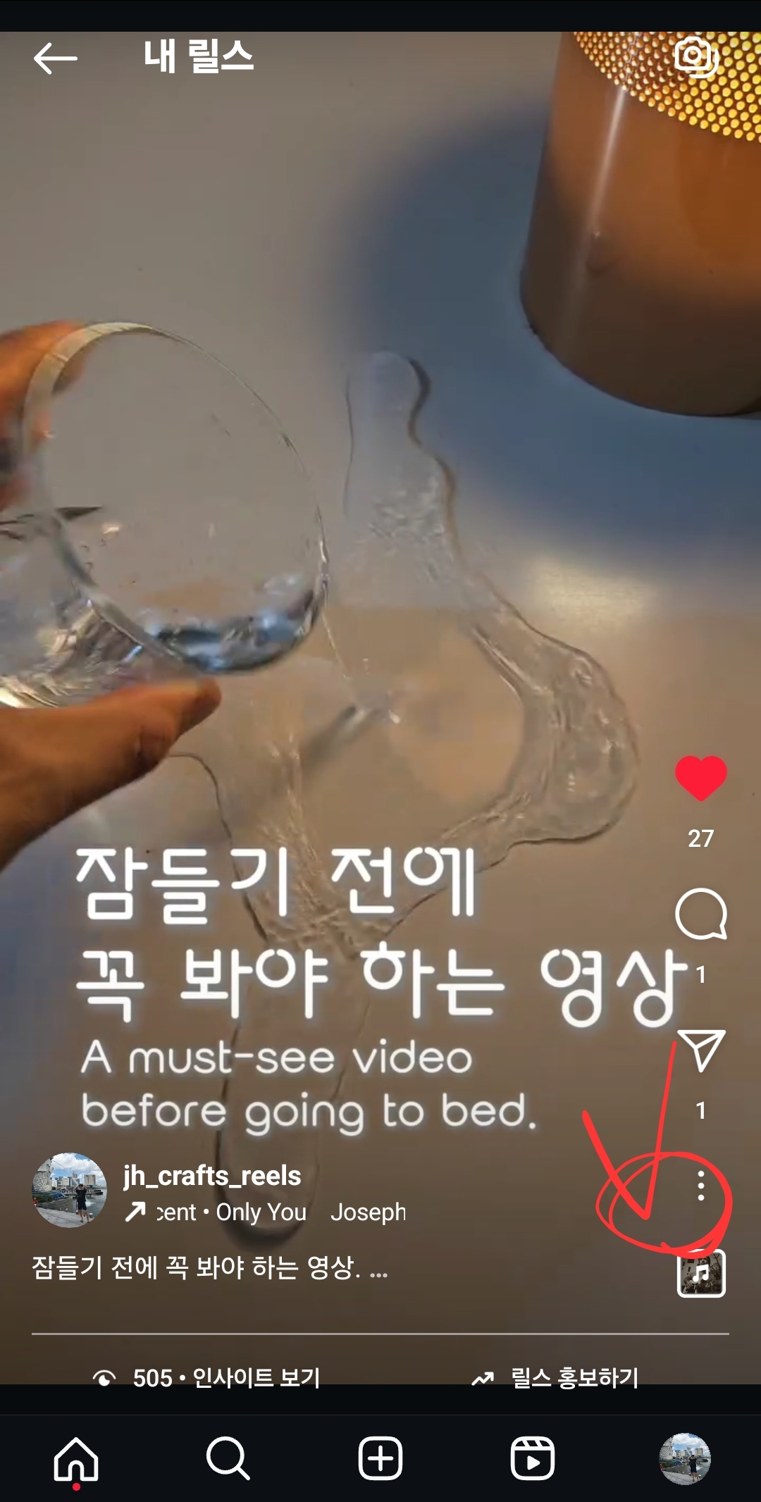 3) 숨기고 싶은 릴스 선택(릴스탭에서) : 프로필 화면에서 '릴스'탭을 클릭합니다. 숨기고 싶은 특정 릴스를 선택합니다. 릴스가 재생되면 화면 오른쪽 아래 있는 세 점(...)을 터치합니다.