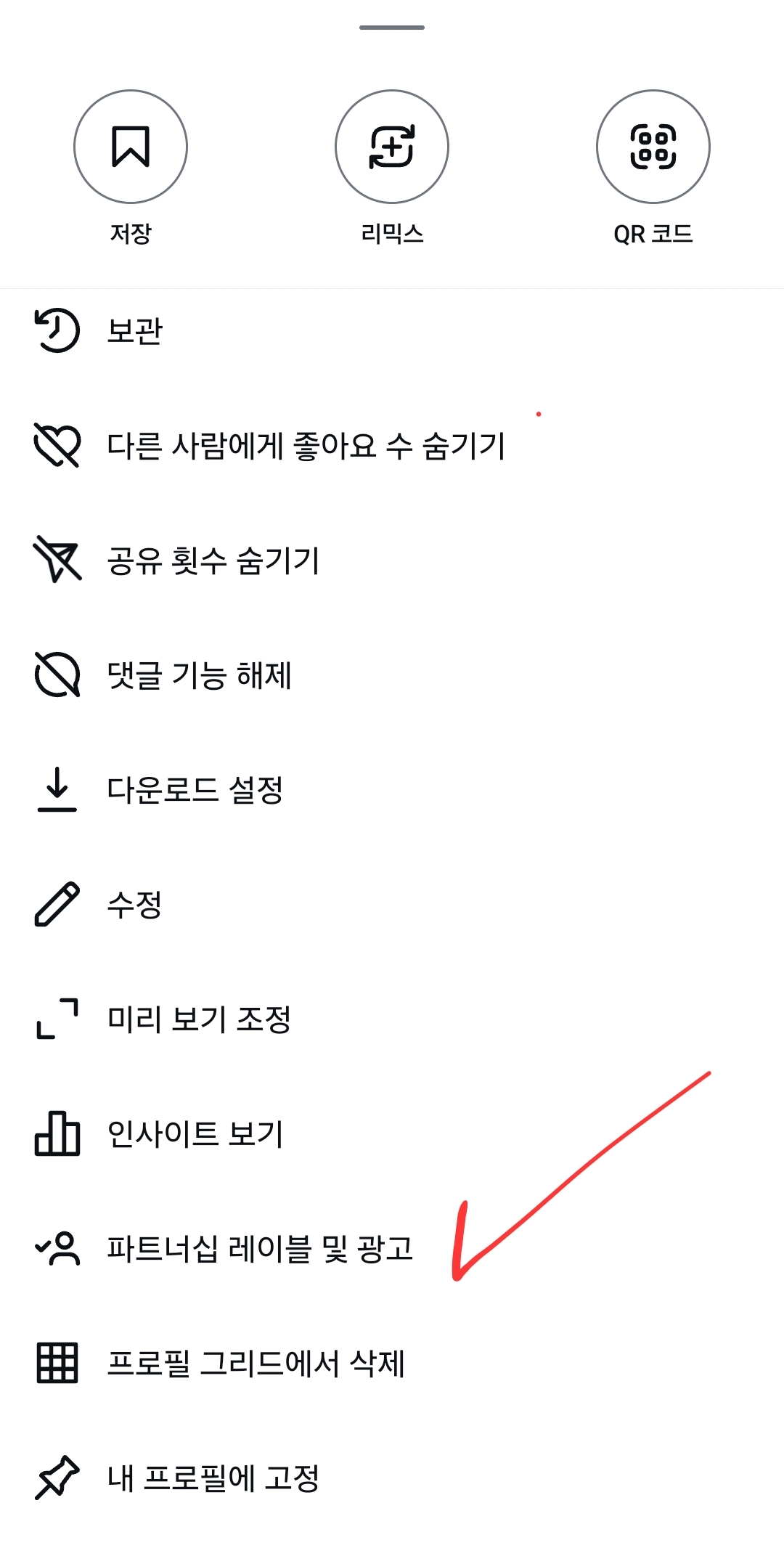 4) 옵션 선택 : 옵션탭에서 가장 아래로 스크롤하여 '프로필 그리드에서 제제거' 또는 'remove from profile grid' 옵션을 선택합니다. 이 작업은 릴스를 프로필 그리드에서 제거하지만, 릴스 자체는 삭제되지 않으며, 다른 사용자들이 릴스를 직접 찾거나 릴스탭에서 볼 수 있습니다.