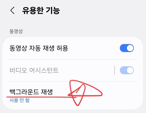 설정 메뉴에서 아래로 스크롤한 다음, '유용한 기능'항목을 선택한 뒤 백그라운드 재생 옵션을 찾아 켜짐으로 활성화 해주세요.