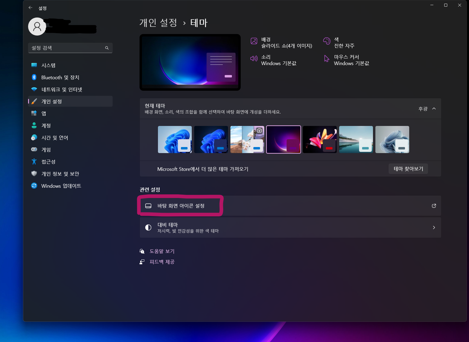 3. 개인설정 클릭 후 팝업창에서 '테마' 클릭.