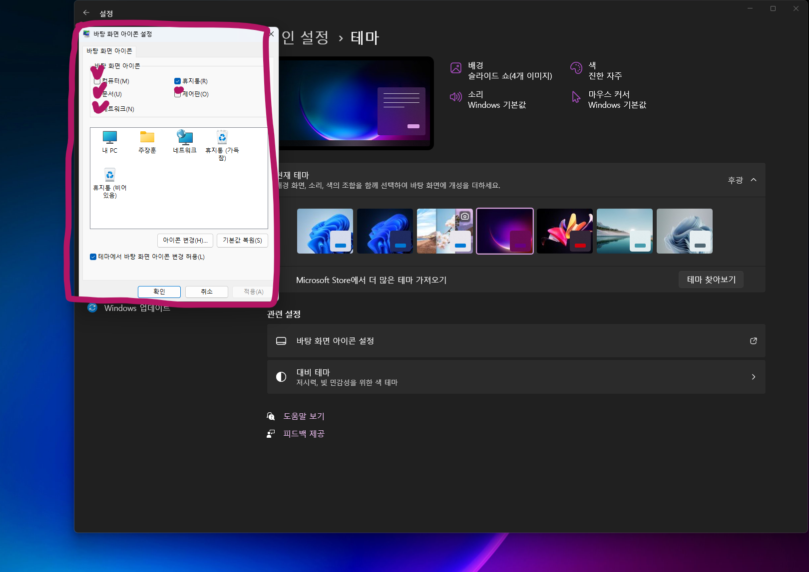 ●윈도우 바탕화면에서 기본 아이콘을 숨기거나 나타내기.