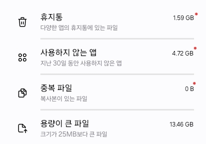 "중복 파일", "큰 파일", "사용하지 않는 앱" 항목을 확인한다. 갤럭시가 자동으로 정리 대상을 제안해준다. - 삭제 실행