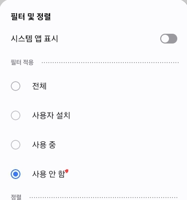 "설정" > "앱"으로 들어가 설치된 앱 목록을 본다. 화면 오른쪽 위 점 세 개를 눌러 "사용하지 않는 앱" 필터를 적용하면 더 쉽게 찾을 수 있다. - 삭제 또는 비활성화