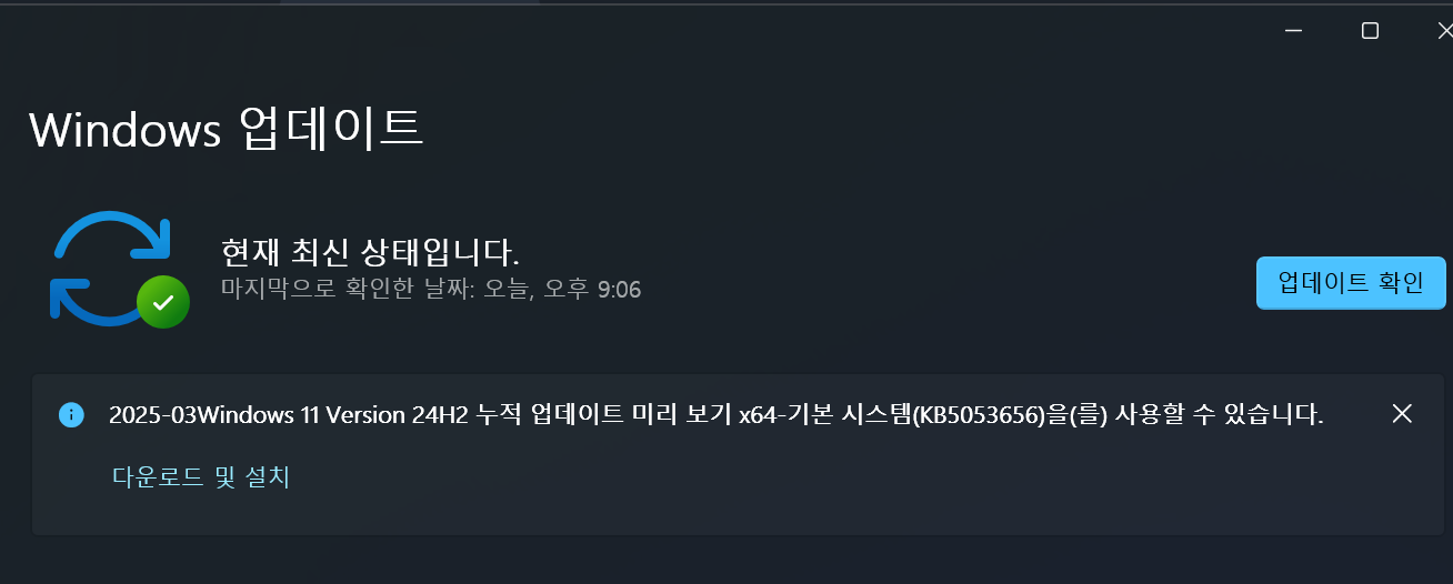 - 해결법: 설정 → "Windows 업데이트" → "업데이트 확인", 모바일 "내 PC" 앱 연동.