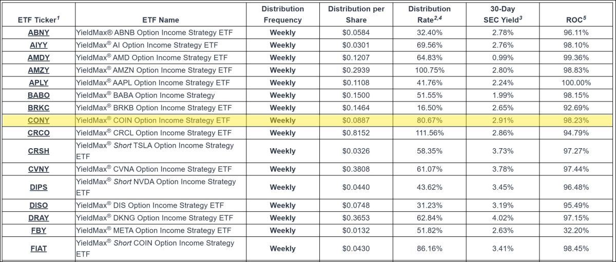 이번 Group 2에는 여러 ETF가 포함되었지만, 그중에서도 투자자들의 관심은 CONY ETF(Connected Technology YieldMax ETF)에 집중되고 있습니다.